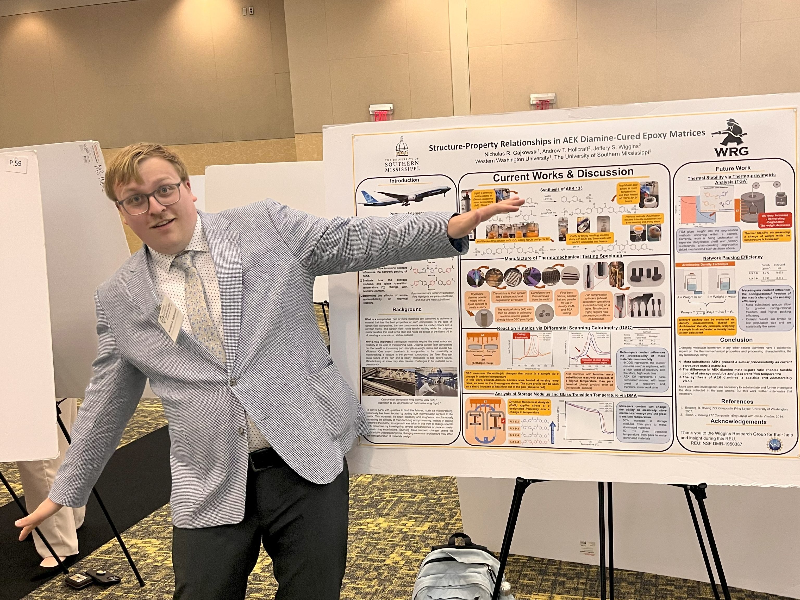 I also spent a summer at the University of Southern Mississippi as a part of the National Science Foundation’s Research Experience for Undergraduates program. There I worked with graduate student Andrew Hollecraft in the Wiggins Research Lab. Here the project was mainly focused on exploring aerospace composites and how a small change like the connection of a few carbons can affect the properties of a material.